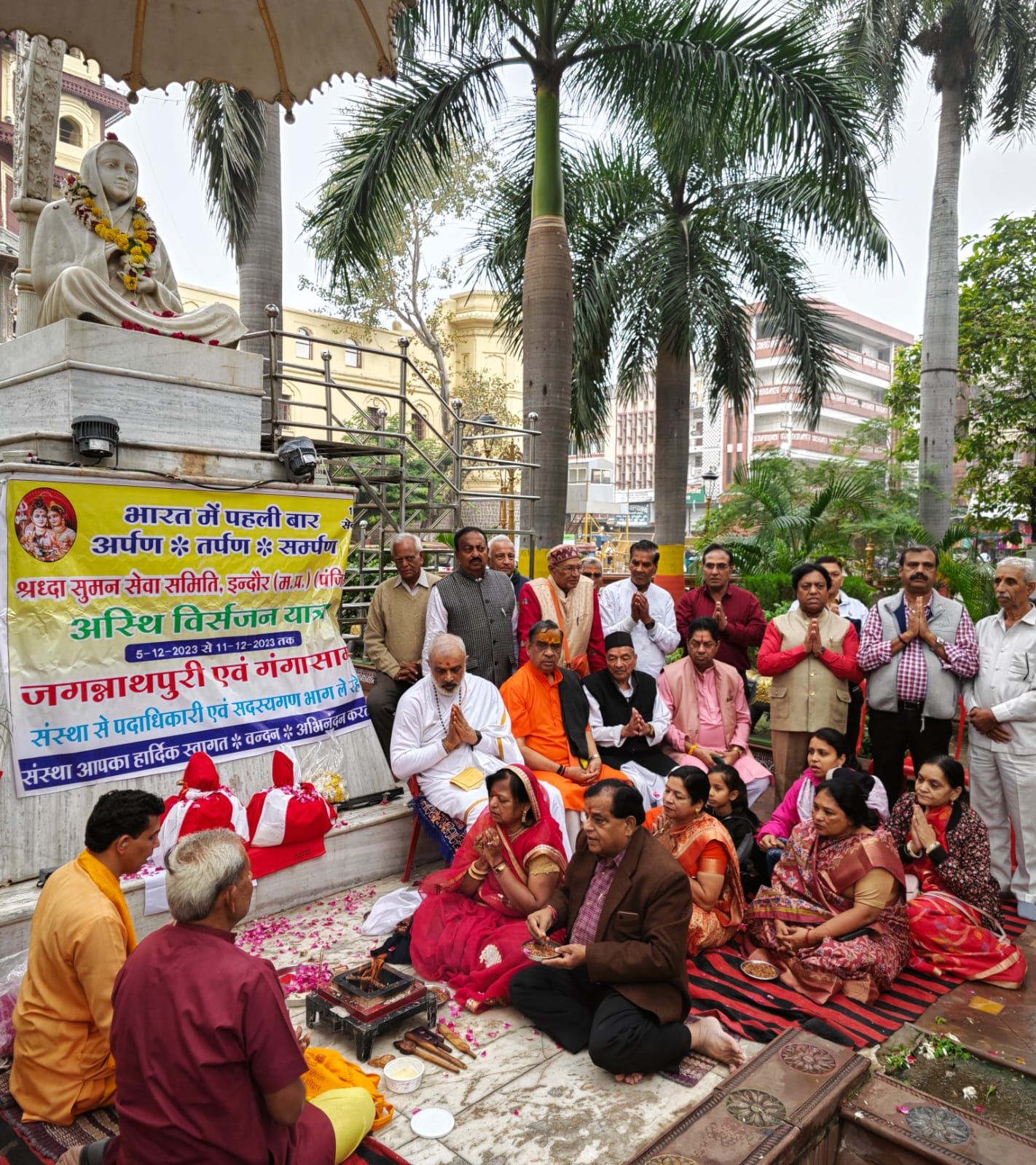 समिति के संस्थापक अध्यक्ष मोहनलाल सोनी एवं संयोजक हरि अग्रवाल ने बताया कि सदगुरू अण्णा महाराज, आचार्य पं. रामचंद्र शर्मा वैदिक एवं पं. योगेन्द्र महंत के आतिथ्य में आज सुबह राजबाड़ा स्थित अहिल्या उद्यान पर गायत्री शक्तिपीठ के विद्वानों द्वारा विधि-विधान के साथ अस्थि कलश का पूजन किया गया। इन अस्थि कलशों में शहर के 400 से अधिक दिवंगतों की अस्थियां एकत्र की गई है। ये अस्थियां ऐसे दिवंगतों की है, जिनके परिजन किसी कारणवश अब तक इनका विसर्जन पवित्र नदियों में नहीं कर पाए हैं। अब श्रद्धा सुमन सेवा समिति के 21 कार्यकर्ता राजेन्द्र गर्ग, डॉ. चेतन सेठिया एवं जगमोहन वर्मा के साथ पहले जगन्नाथपुरी एवं वहां से गंगा सागर ले जाकर वहां भी हवन-पूजन के साथ इनका विसर्जन करेंगे। सदगुरू अण्णा महाराज एवं अन्य वक्ताओं ने अस्थि विसर्जन एवं पूजन की महत्ता बताई।